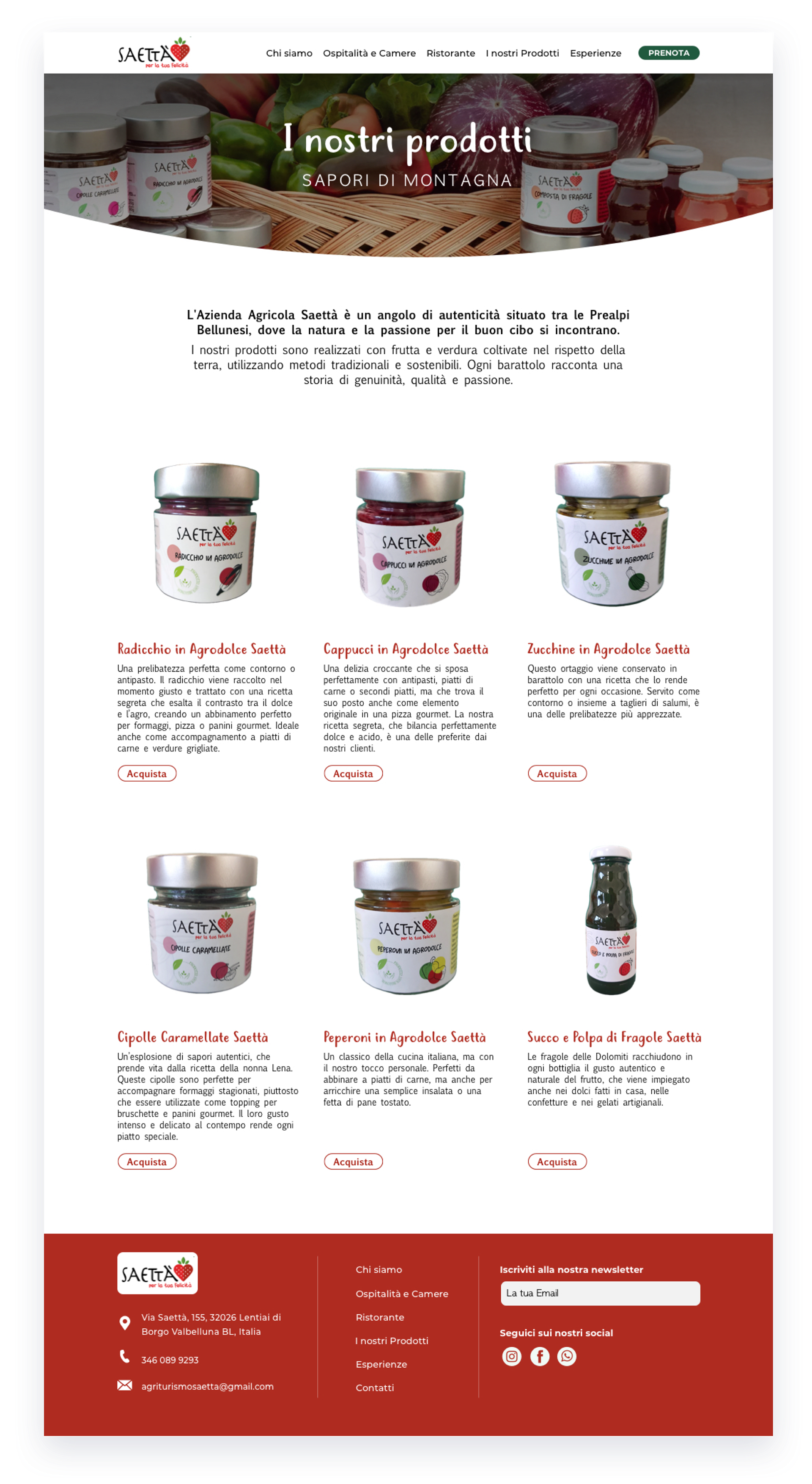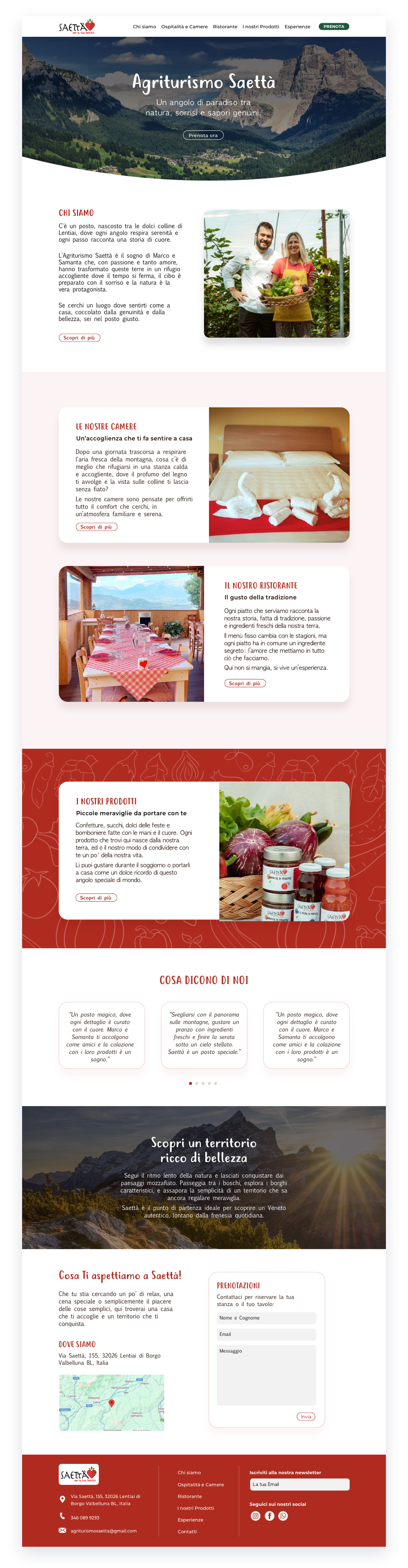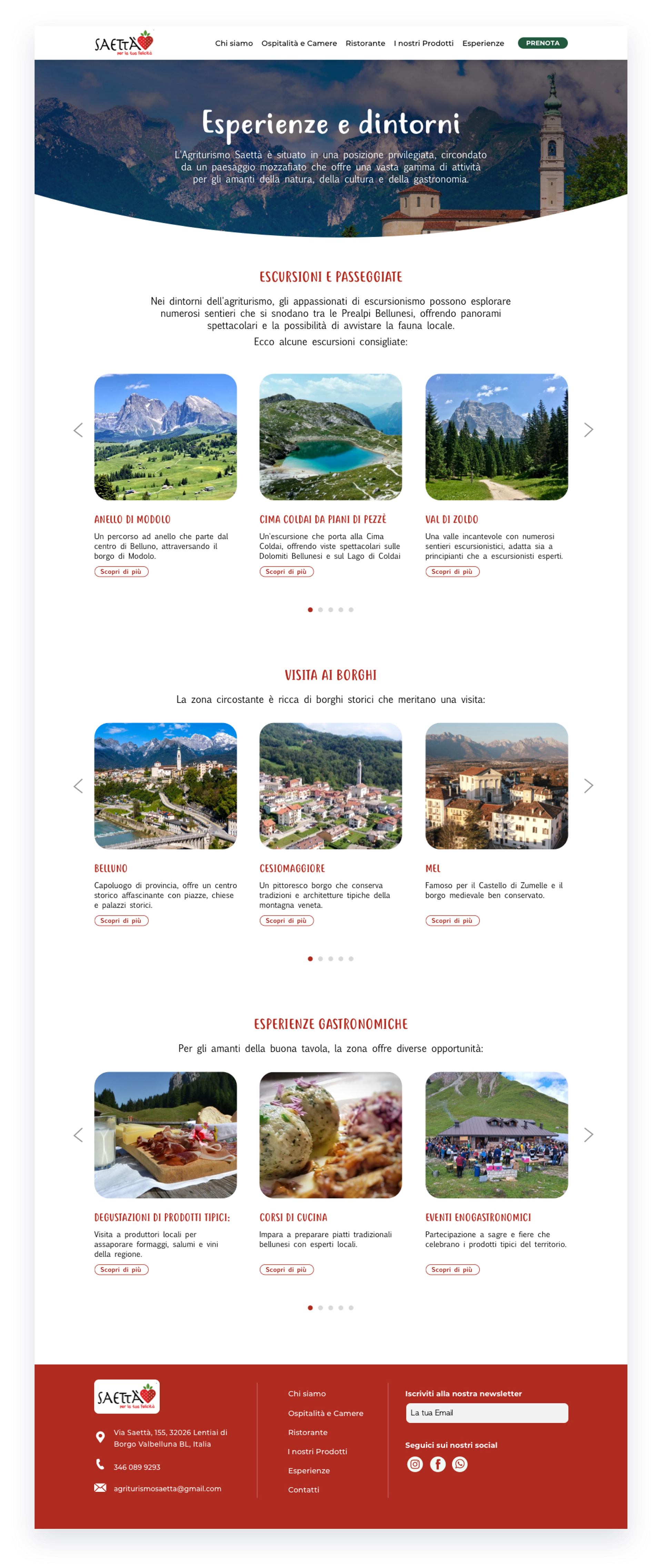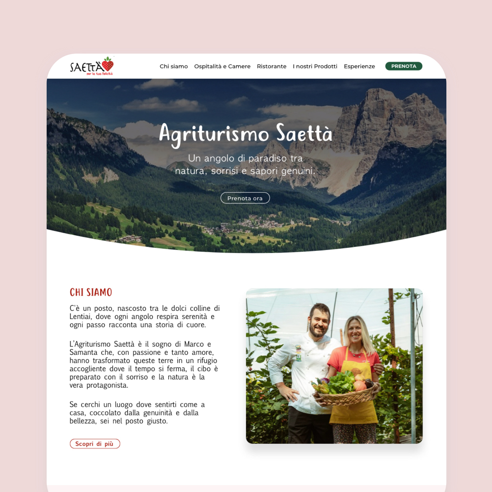 Per l’agriturismo Saettà sito in provincia di Belluno, immerso in un panorama idilliaco tra le Dolomiti, ho realizzato il sito dell’azienda agricola che conta la sezione dedicata al pernottamento in B&B, il ristorante, la loro storia, l’e-commerce dei loro prodotti e una parte che racconta le attività che si possono fare nelle vicinanze.