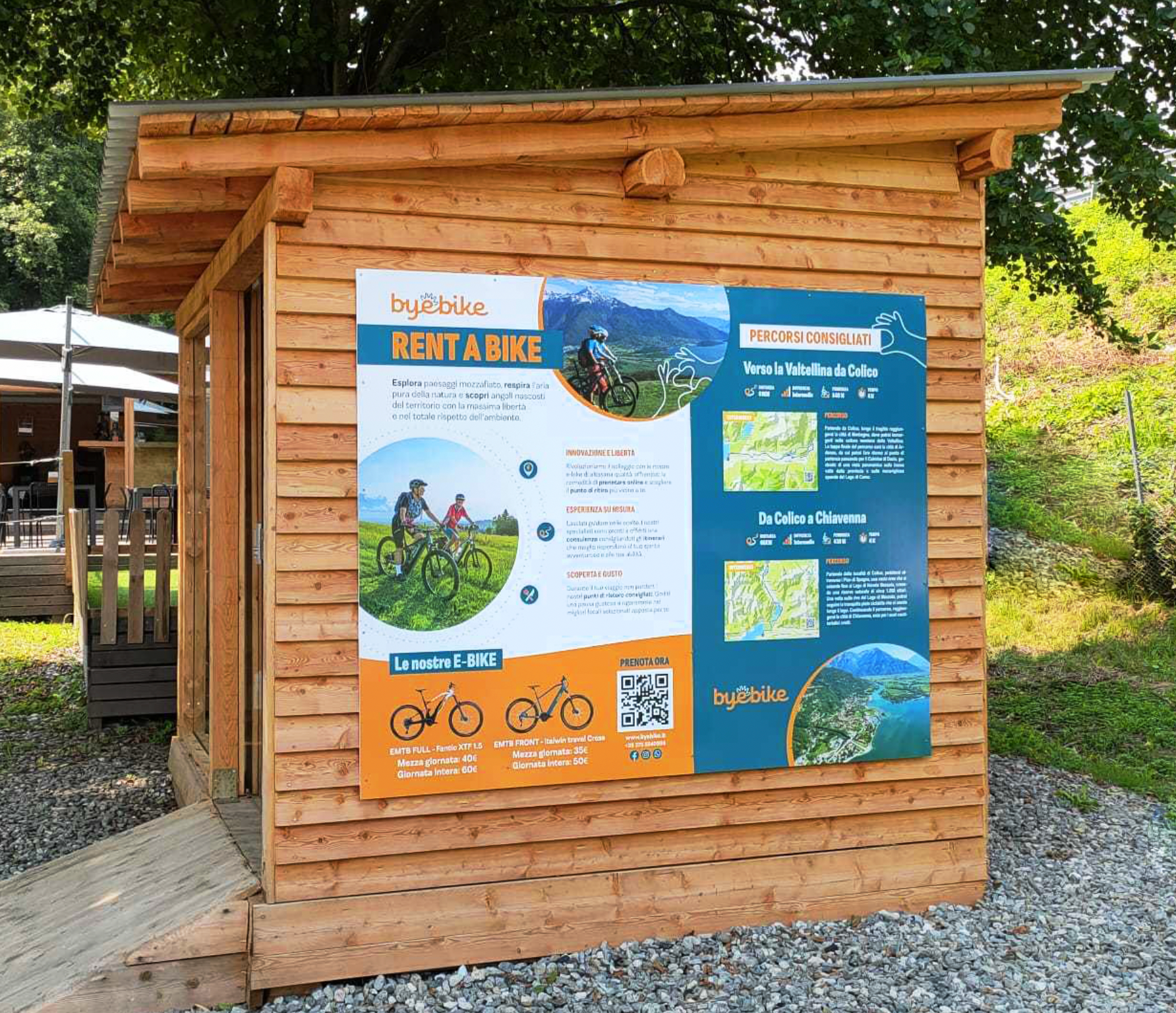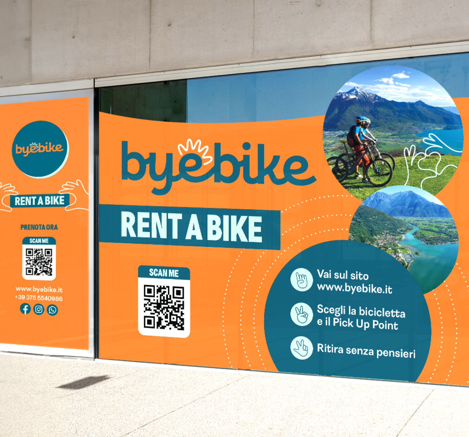 Per Byebike, crescente azienda nel settore del noleggio di E-Bike sul lago di Como, ho realizzato materiale pubblicitario come banner, forex e vetrofanie per i loro punti di ritiro e manutenzione delle bici elettriche.