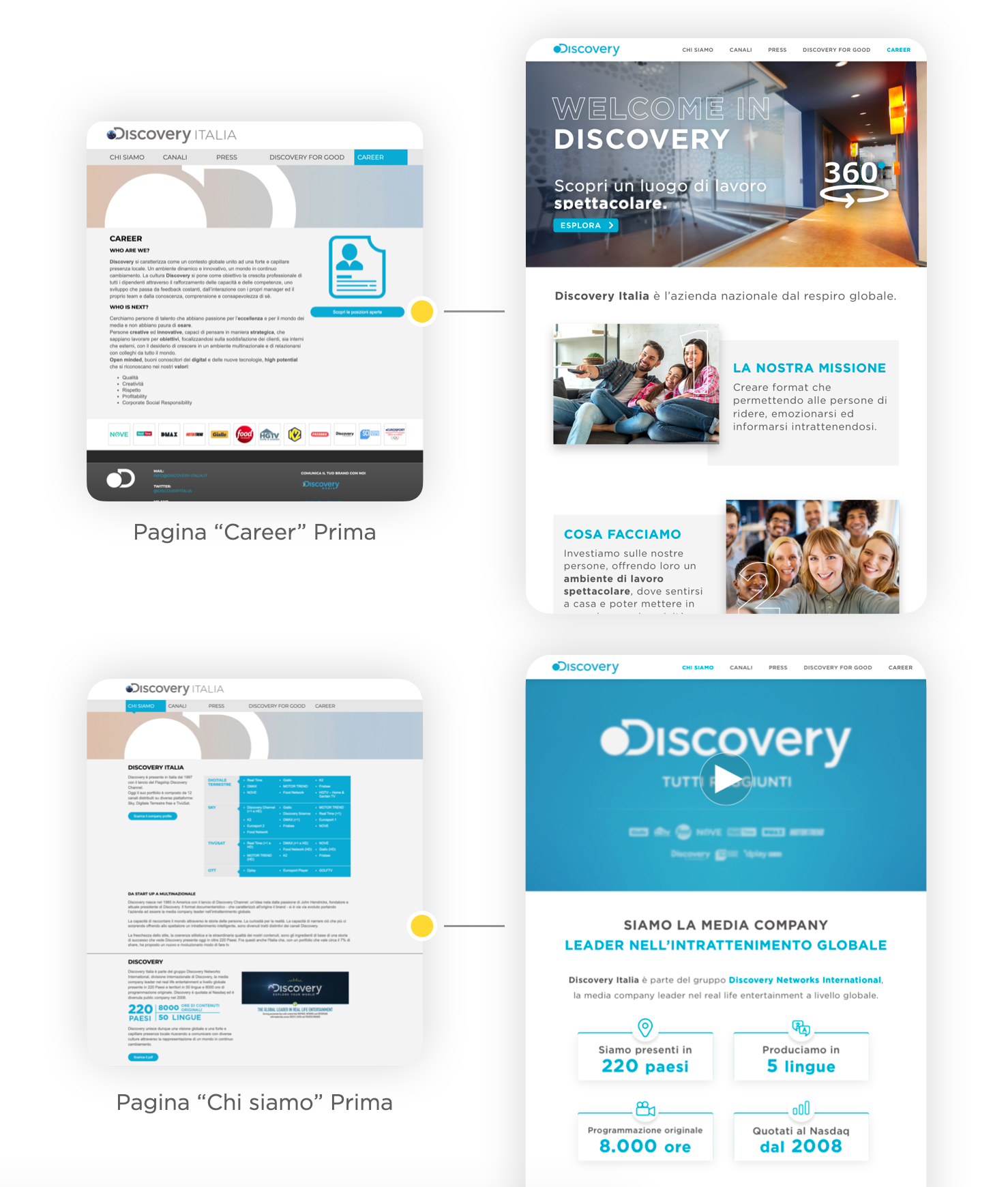 Discovery Media richiedeva il redesign di alcune parti del sito vetrina già esistente per rendere più contemporaneo e fresco lo stile comunicativo con lo scopo di dare un’identità visiva anche a questa unità di Discovery che fin prima era basilare e funzionale alla raccolta di lead commerciali pubblicitari.
