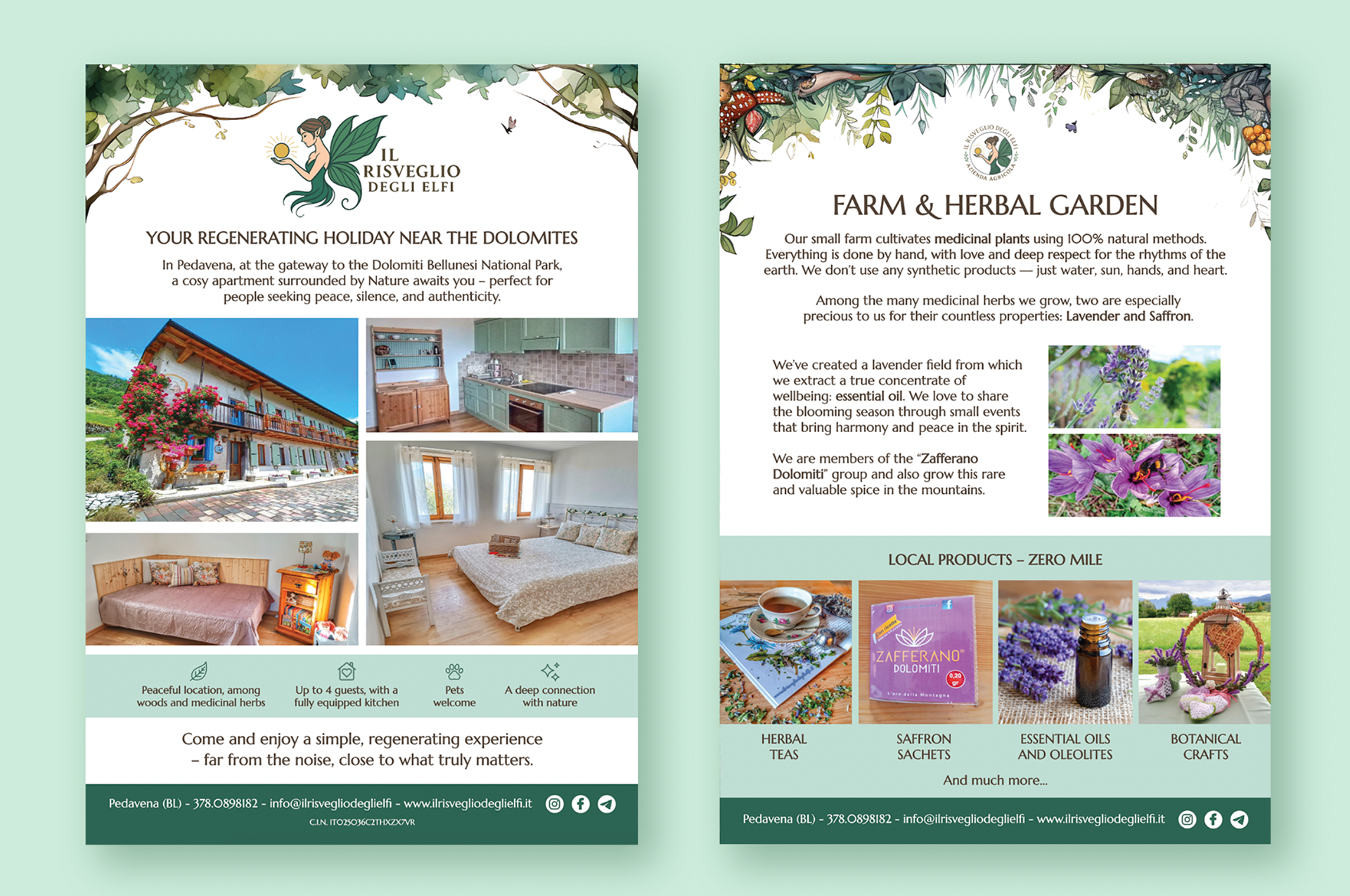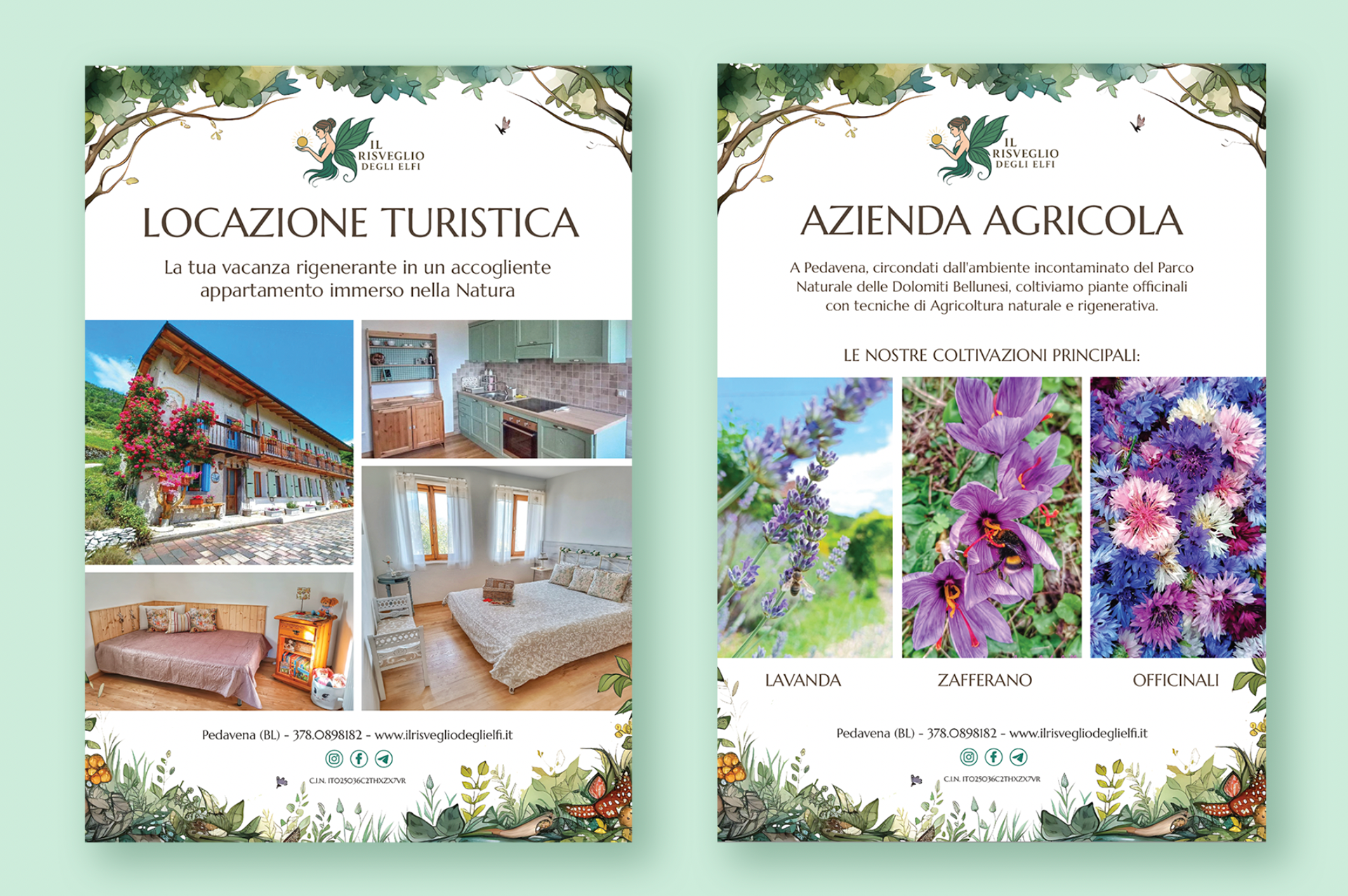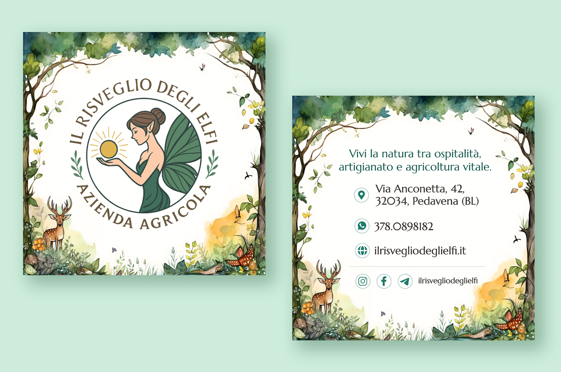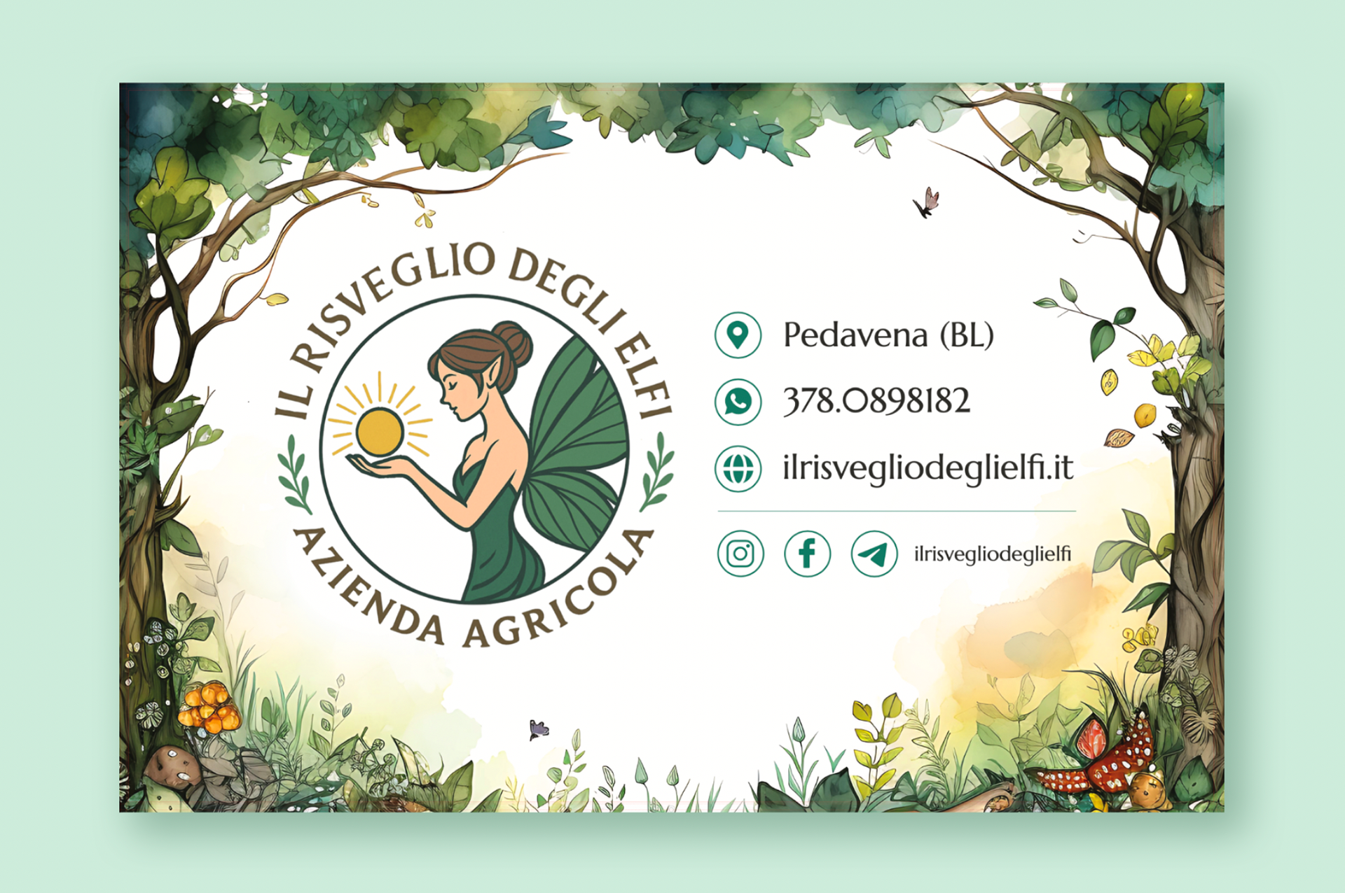 Per l'azienda agricola il risveglio degli elfi ho realizzato l'immagine coordinata comprensiva di logo in due versioni (quadrata e orizzontale), biglietti da visita, banner pubblicitari fieristici e molto altro