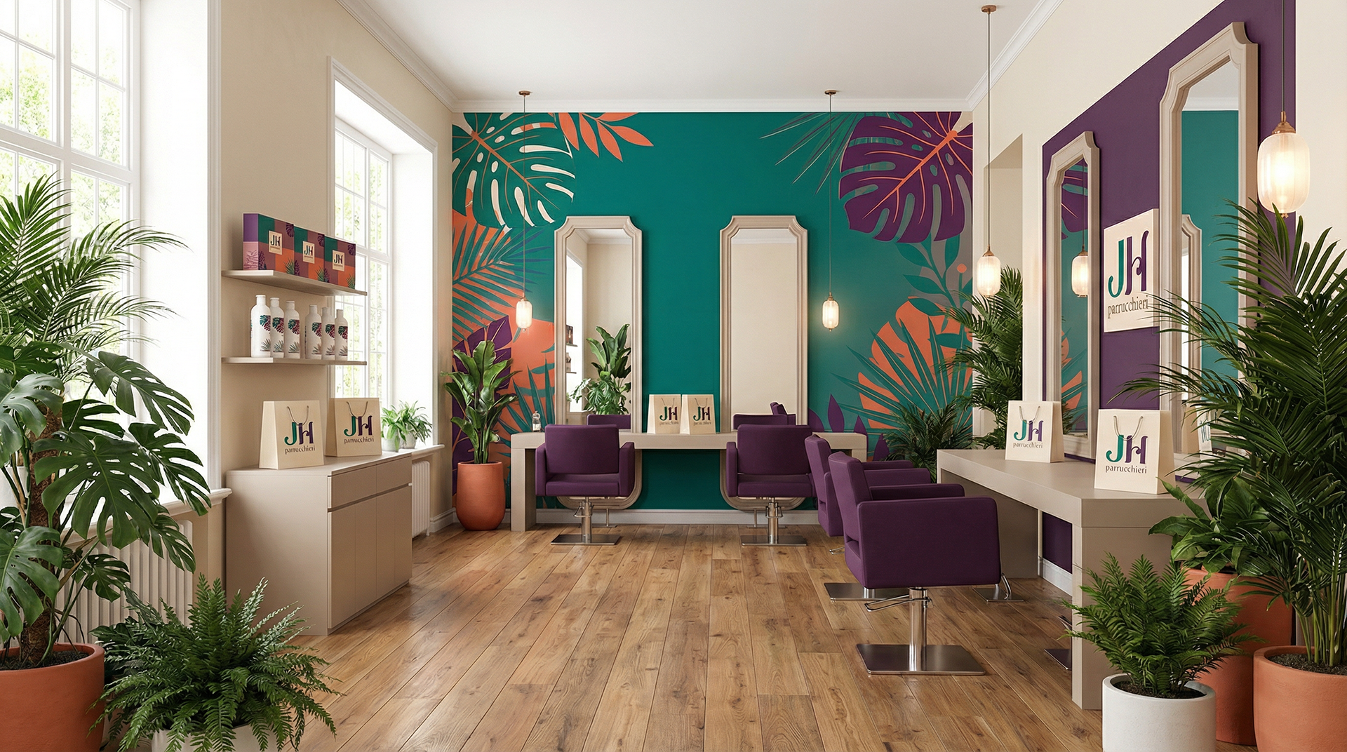 Il progetto per JH Parrucchieri nasce dall'esigenza di ridefinire completamente l'identità del brand e l'esperienza del cliente all'interno del salone. L'obiettivo principale era quello di evolvere da un'immagine percepita come funzionale ma prevalentemente maschile, a un concept più sofisticato, accogliente e in linea con le tendenze attuali, con un focus specifico sull'attrazione di una nuova clientela femminile.