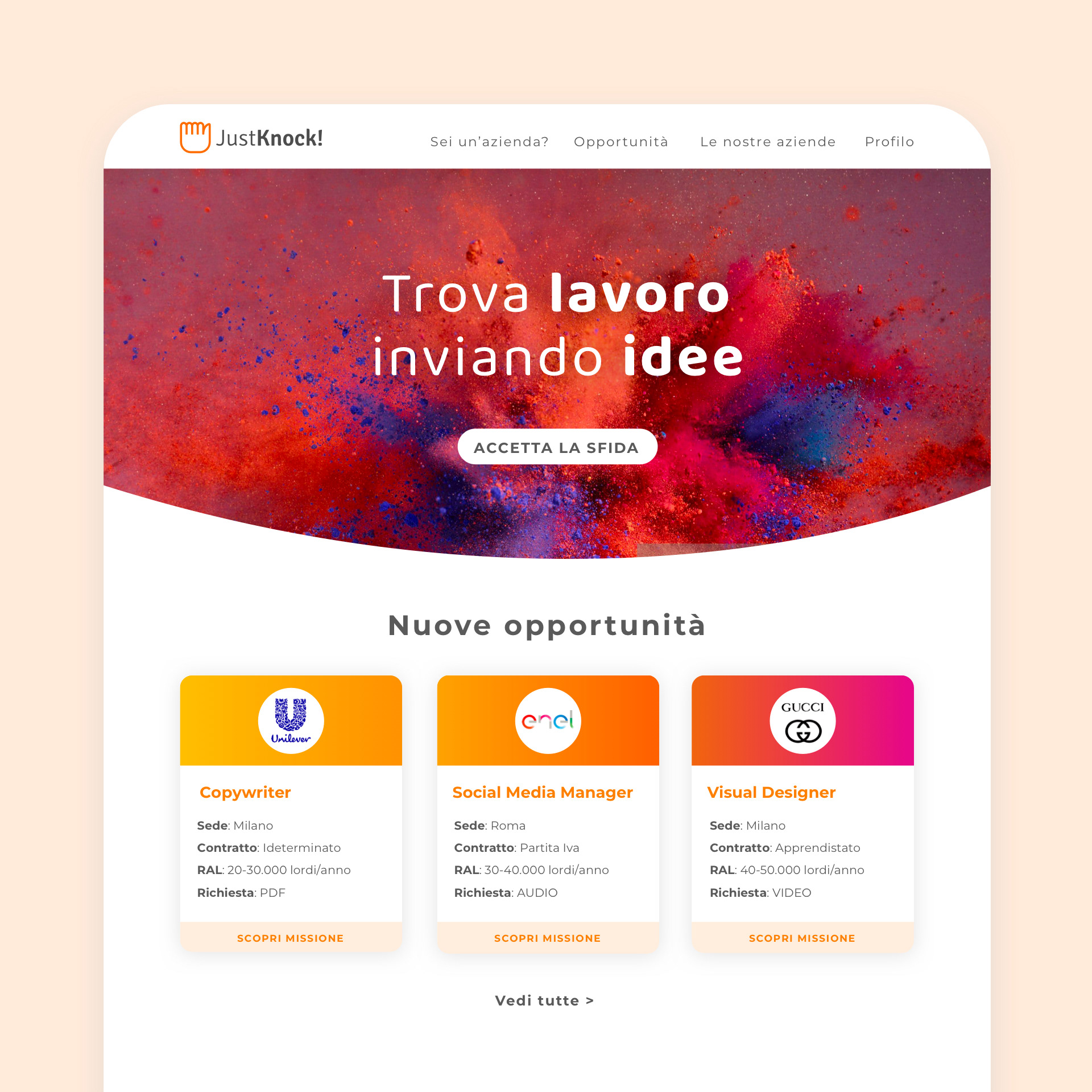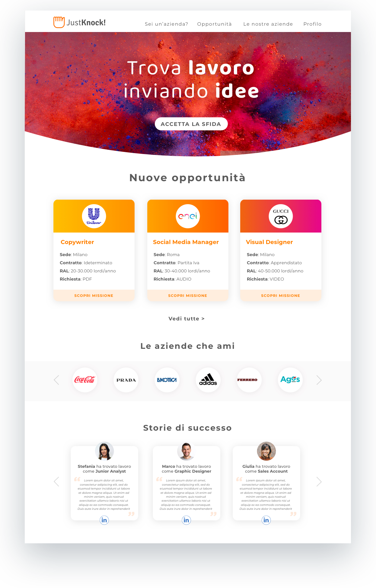 Ho seguito il completo redesign dell’esperienza utente/azienda/staff e ricreato la nuova interfaccia avendo due obiettivi principali: 1) rendere più accattivante candidarsi 2) rendere la votazione dei progetti anonimi un’esperienza fluida e veloce. Nel corso degli anni ho sviluppato anche molte funzionalità aggiuntive tra cui la possibilità per le aziende di utilizzare Just Knock come tool interno per la loro job rotation.