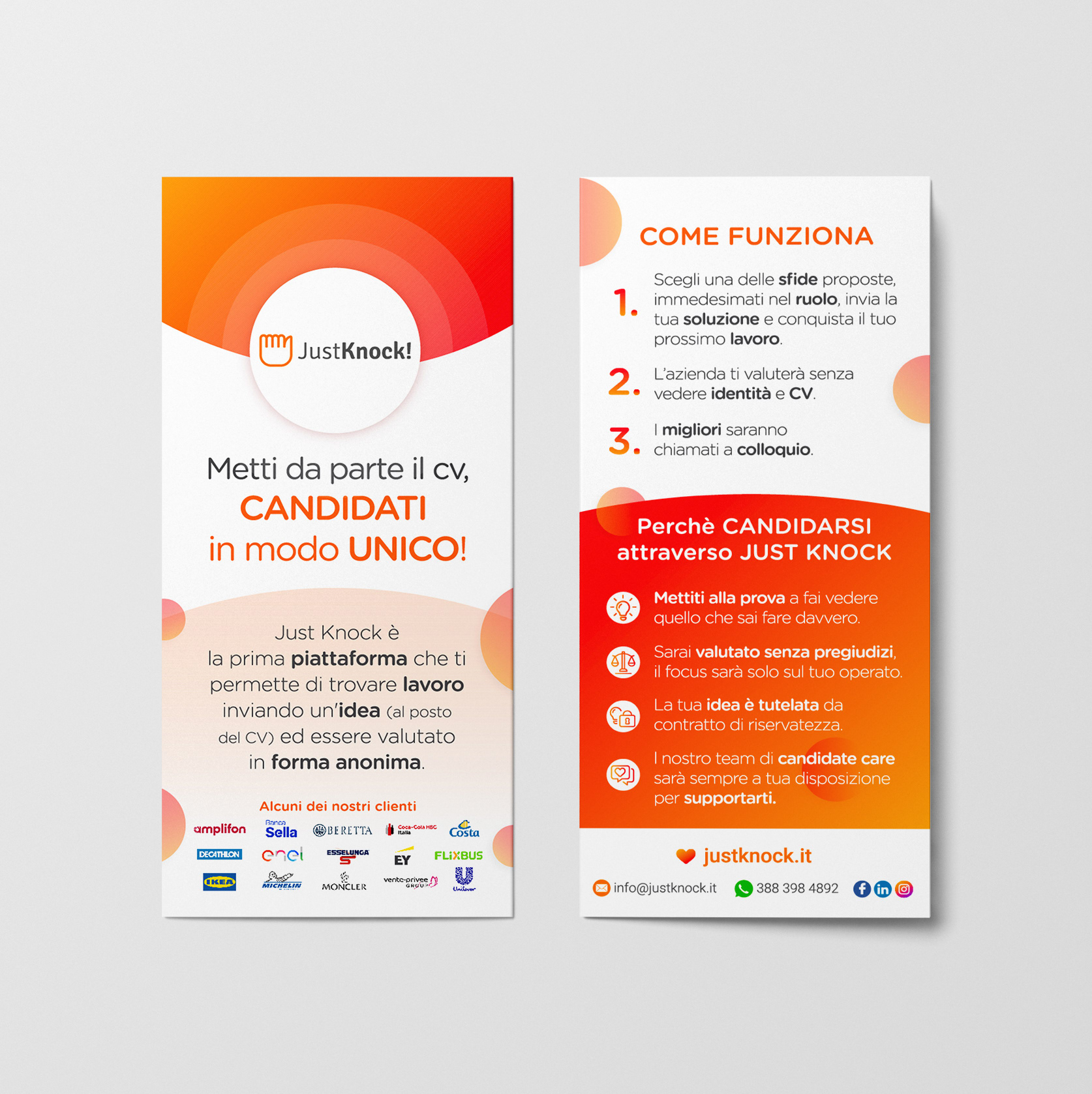 Just Knock necessitava anche di flyer da distribuire ad una serie di career day con l’obiettivo di far conoscere il metodo innovativo di selezione con cui i giovani talenti possono candidarsi e ottenere il lavoro dei loro sogni.