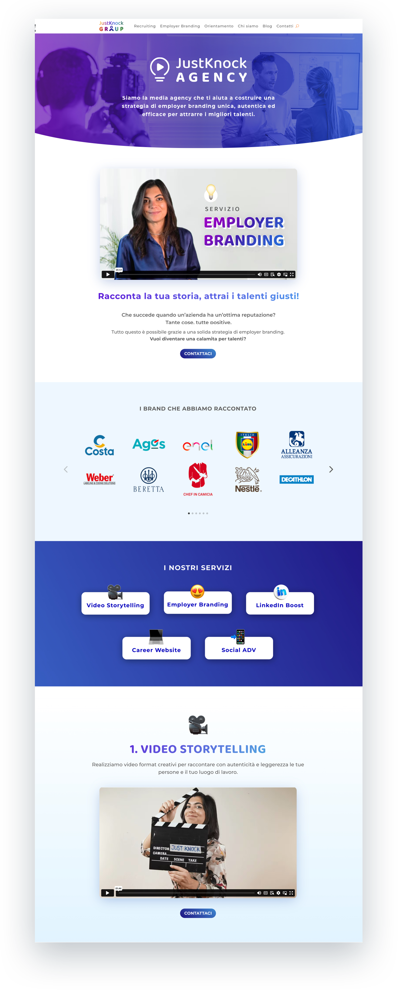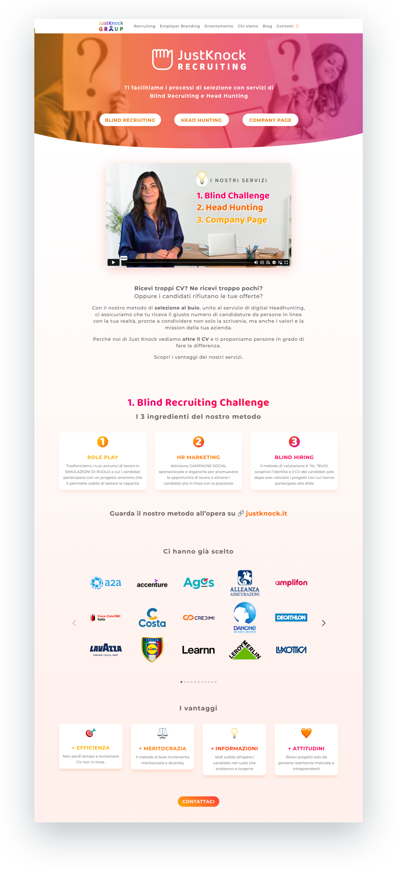 L’azienda Just Knock operante nel settore delle risorse umane ha sviluppato negli anni una serie di numerosi servizi intorno al suo prodotto di punta (la piattaforma di blind recruiting) che avevamo bisogno di essere esaltati e spiegati al meglio.